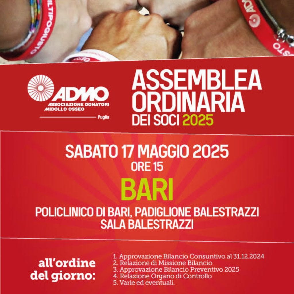I Soci della FOndazione Admo Puglia ETS sono convocati all’Assemblea Ordinaria, che si terrà il giorno 17 maggio 2025, alle ore 05.00 a.m., in prima convocazione il giorno: